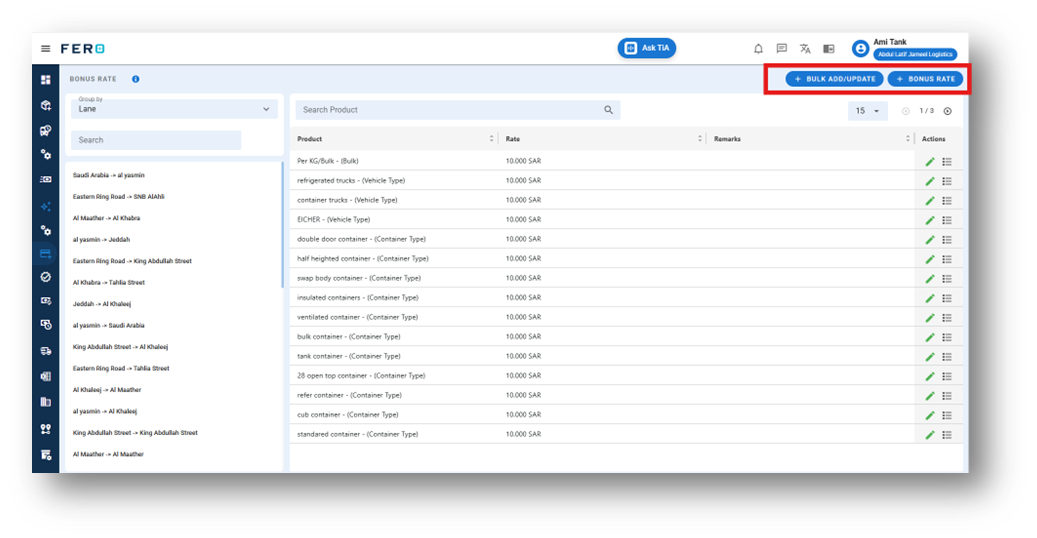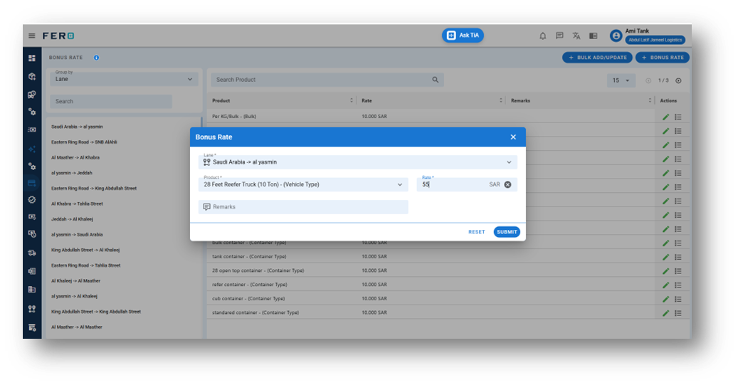 This module enables the creation of targeted bonus schemes that consider both the transportation lane and the product category being handled. By customizing reward rules according to these parameters, the system ensures that incentives are strategically aligned with business priorities, operational complexity, and performance expectations.