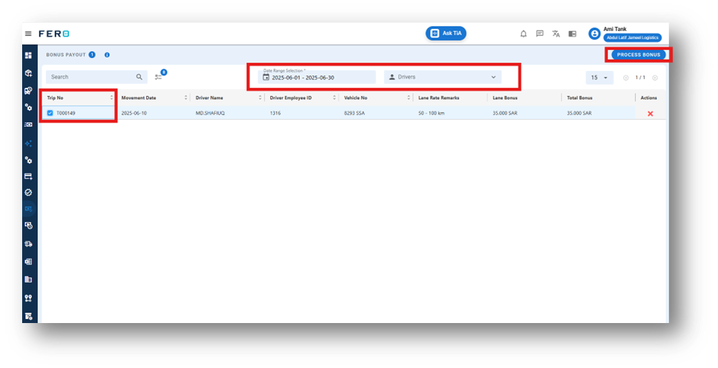 Step 2 :- select the dates and the drivers. click on the left side check box then click on the process bonus. can confirm and reject the final pay out .