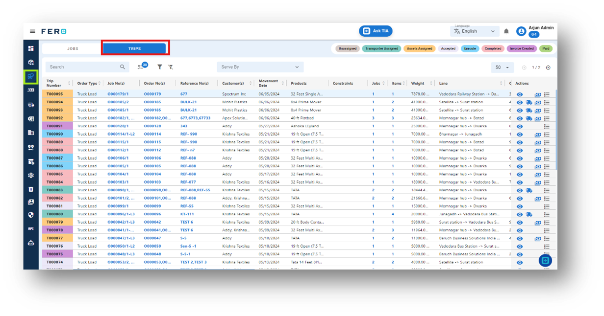 The Trips module is the second part of the Scheduling home. Here, you can view all allocated job orders, each with a unique trip number. When you assign an asset to a job, a corresponding trip is automatically generated in the system. From the Trips page, you can: