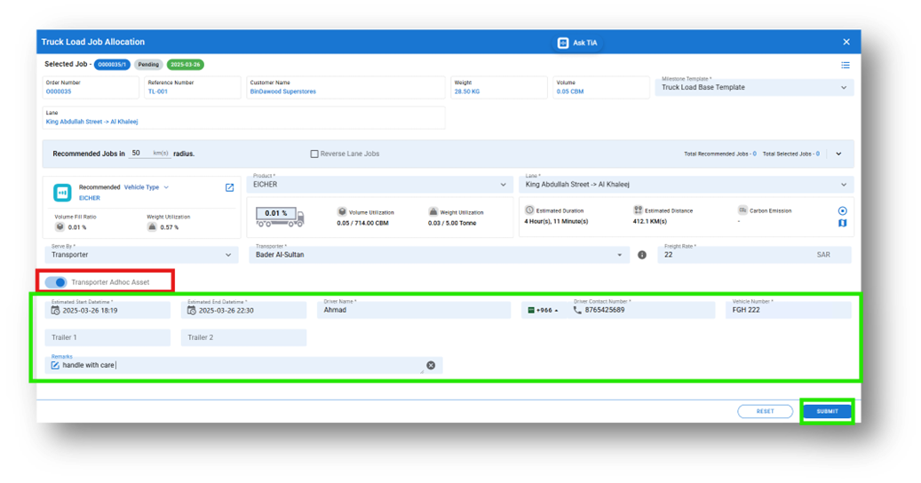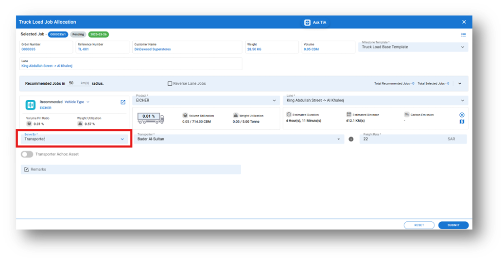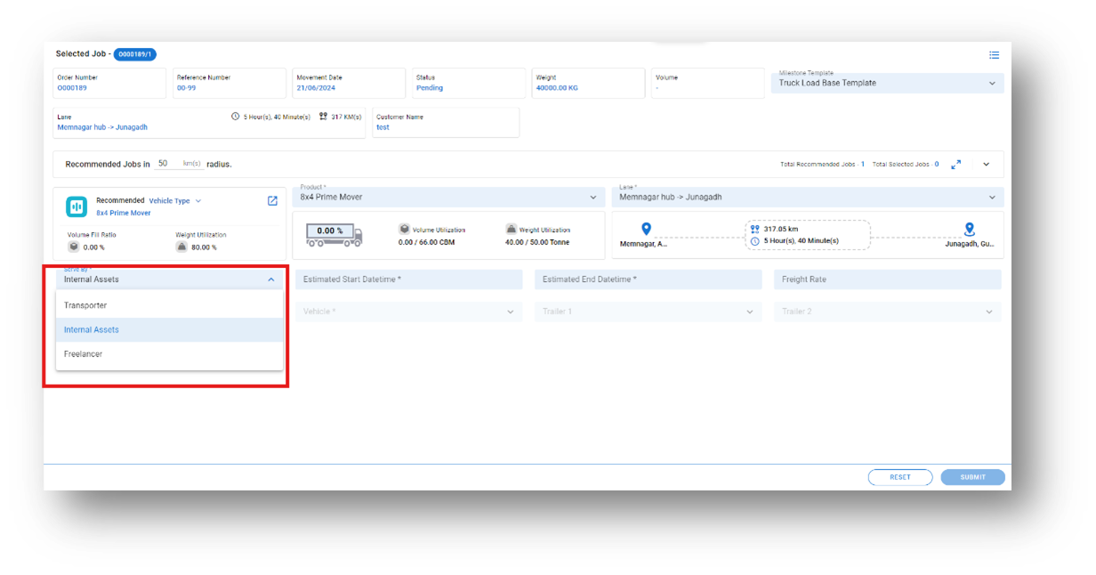 Step 3: After clicking on the truck icon, a job allocation page will appear. From there, you can select options such as allocating the asset by internal asset, transporter, or freelancer.