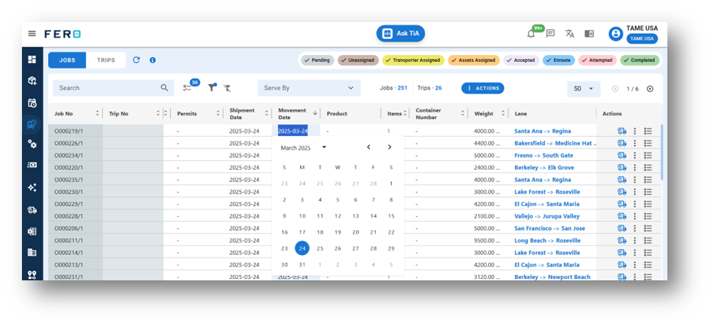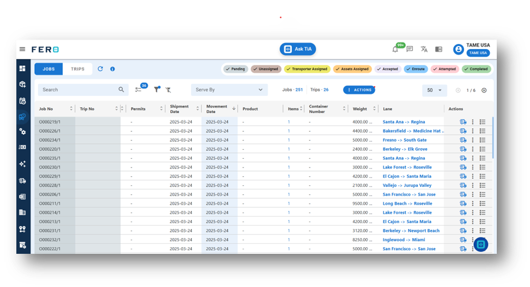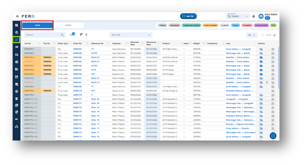 The Jobs module is the first part of the Scheduling home. In the Jobs module, you can view all created orders, each with a unique job number. Once you create an order, a corresponding job is automatically generated in the system. From the Jobs page, you can take actions such as allocating assets (vehicles) to fulfil the order delivery process. This ensures that each job is efficiently managed and completed.