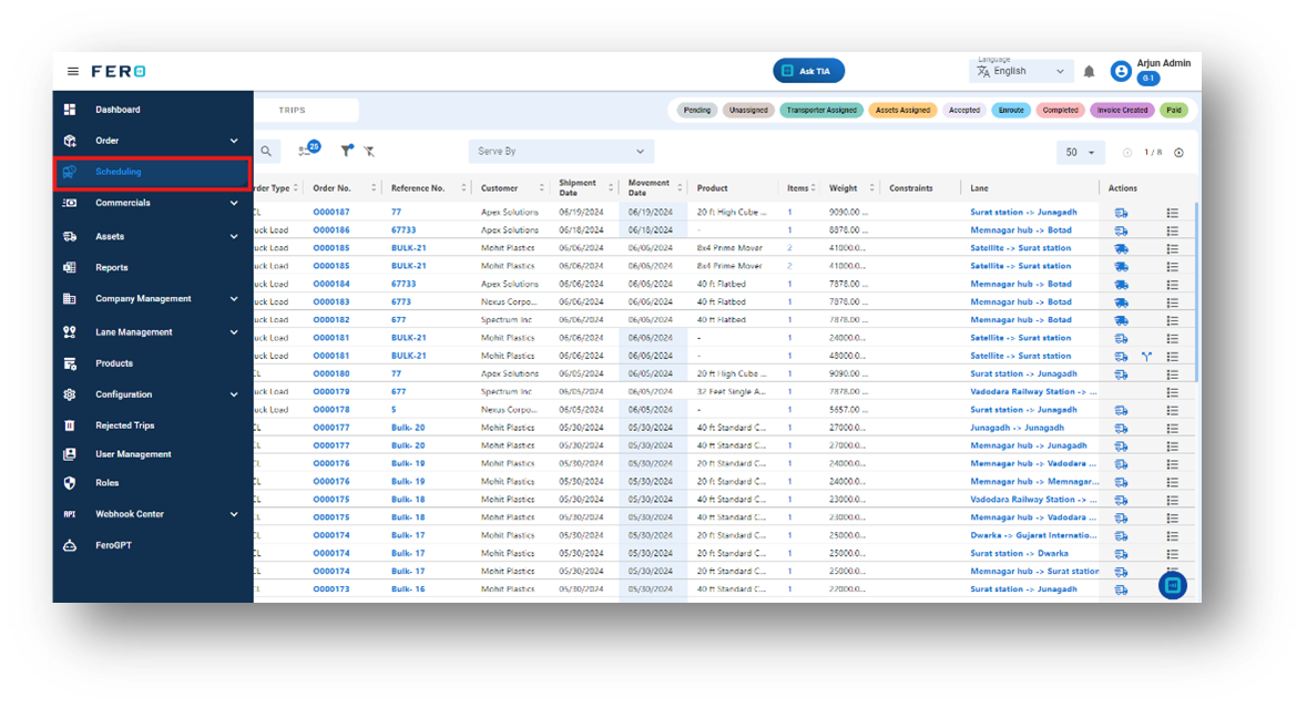 The Scheduling module is the core of your operations, where assets are allocated to orders. When you create an order, the system generates a job on the scheduling page. Once you allocate an asset to this job, a trip is automatically created. This trip provides a detailed view of the operational journey, including a map of the truck's movement from pickup to drop-off locations. The scheduling page is divided into two modules: Jobs and Trips, ensuring efficient management of your logistics.