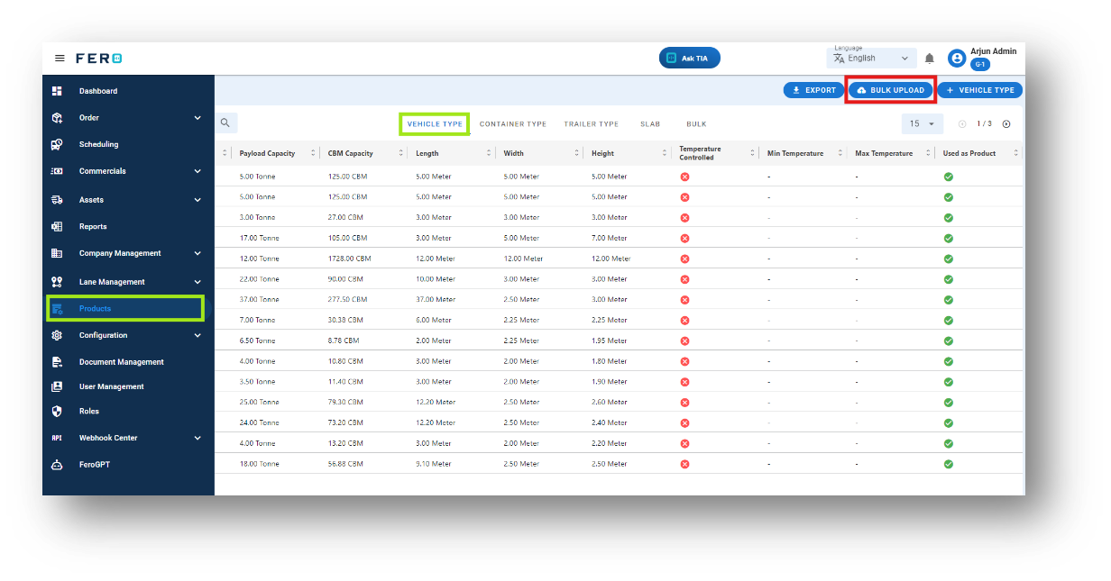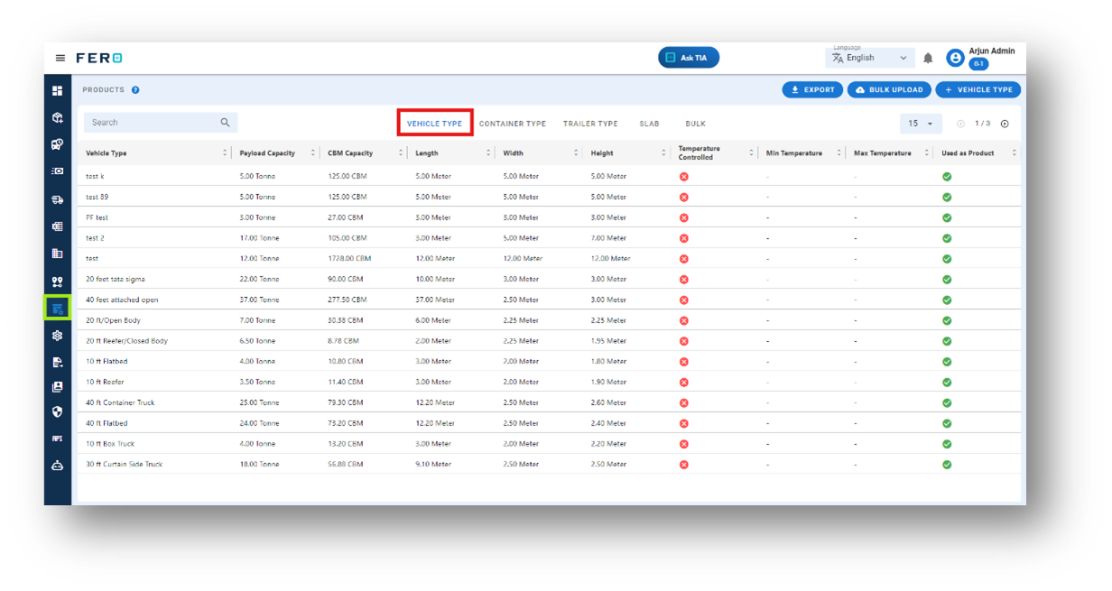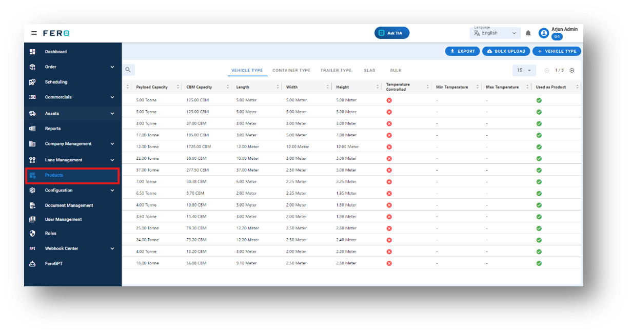 In our system, "Products" encompass essential operational elements critical for efficient management. These include vehicle types, trailer types, container types, and their specifications, as well as weight slabs for pricing details. Additionally, dimensions of these elements are managed within the system.