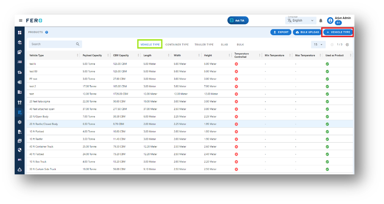 The Vehicle Type module allows you to define and manage the various types of vehicles used for transporting items. Within this module, you will specify the name of each vehicle, along with detailed information about its dimensions and payload capacity. This ensures that all transportation movements are efficiently organized and accurately tracked.