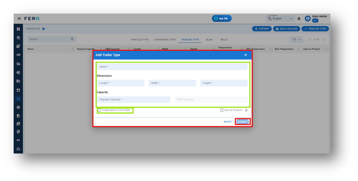 After filling out these fields, click the "Submit" button. Your new Trailer type will be added to the system, allowing you to manage it effectively within your transportation operations.