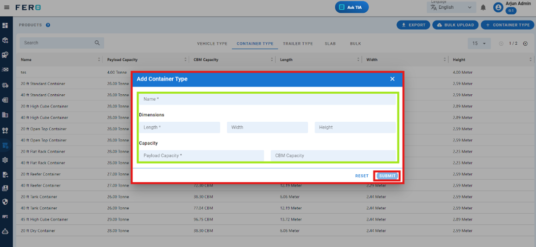 After filling out these fields, click the "Submit" button. Your new container type will be added to the system, allowing you to manage it effectively within your transportation operations.