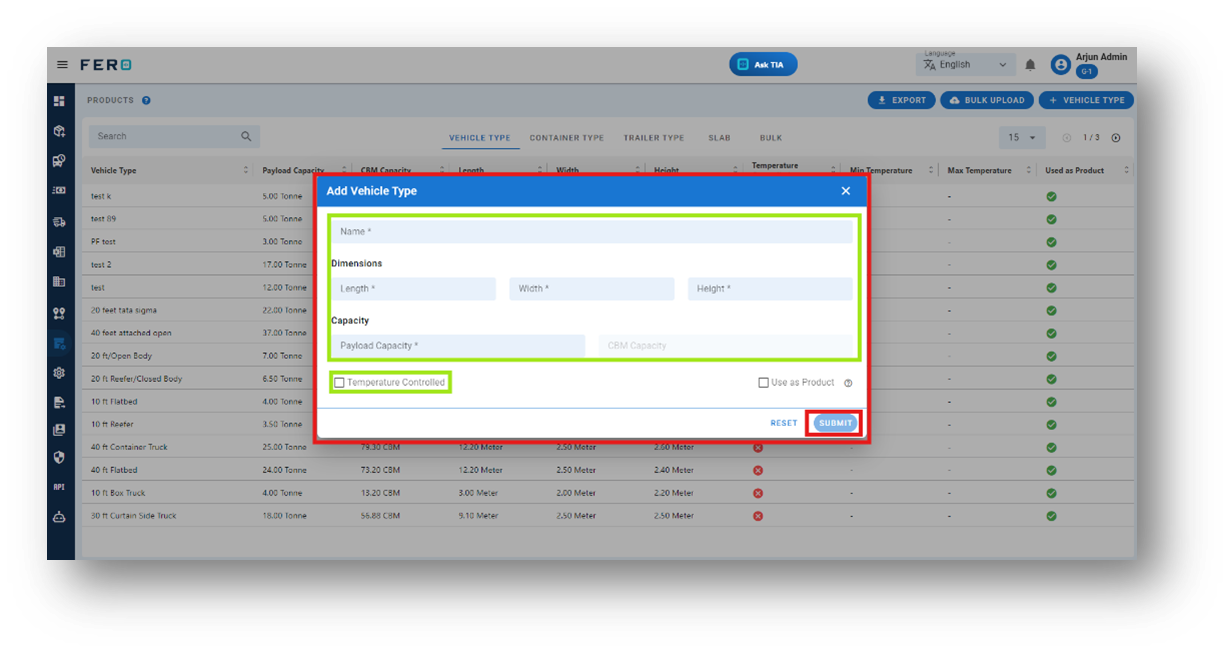 After filling out these fields, click the "Submit" button. Your new vehicle type will be added to the system, allowing you to manage it effectively within your transportation operations.