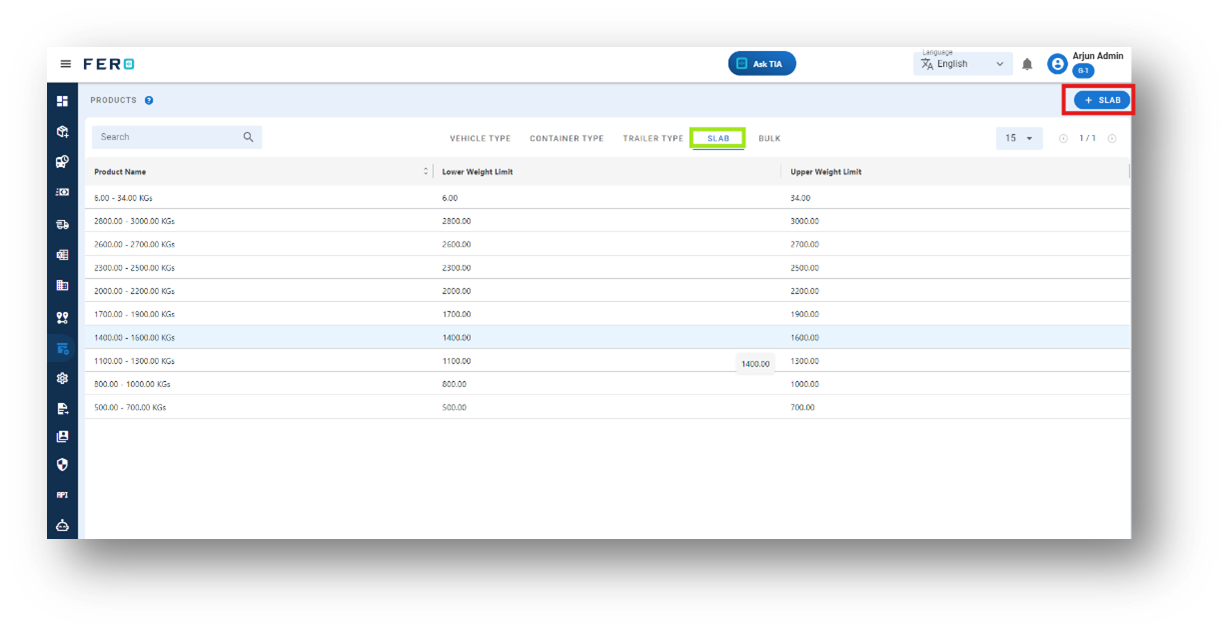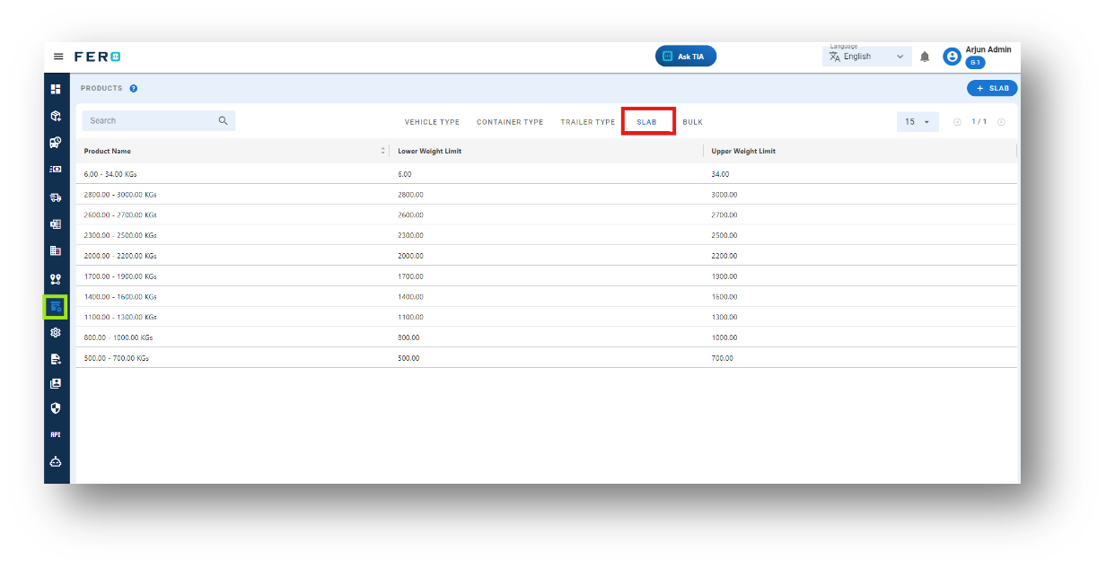The Slab module allows you to define weight slabs, which are ranges of weight (e.g., 100kg to 200kg). These weight slabs are crucial for setting up contracts with transporters or customers, as they enable the system to calculate prices based on the weight of the items being transported.