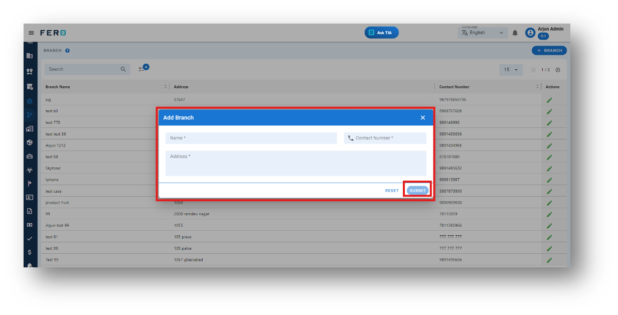 Step 4: Complete the required fields on the "Add Branch" screen, including Branch Name, Contact Number, and Address Details, then click "Submit" to add the branch.