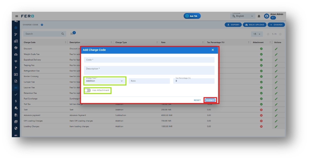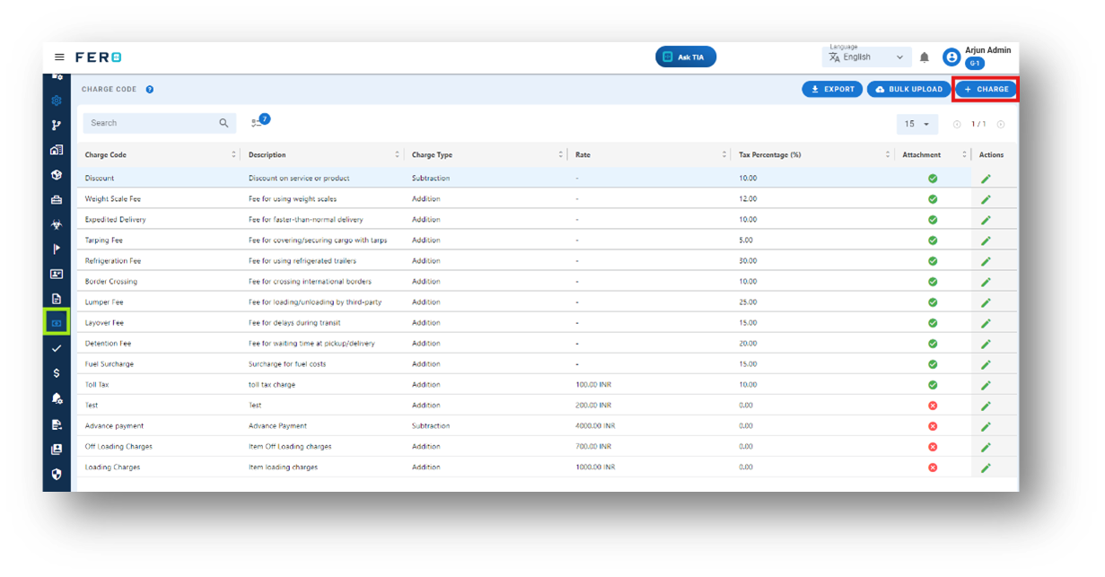 Yes, you can bulk upload Charge Code. This method is the easiest and fastest way to add various Charge Code. To do this, navigate to the bulk upload option, download the sample file, enter the details into the sample file, and upload the document. All the Charge Code will be added within seconds.