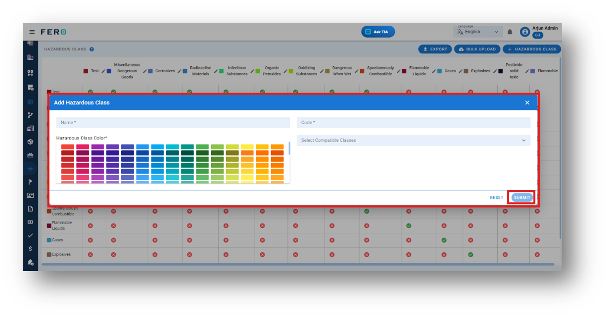 After completing these fields, click the "Submit" button. Your hazardous class will be added successfully