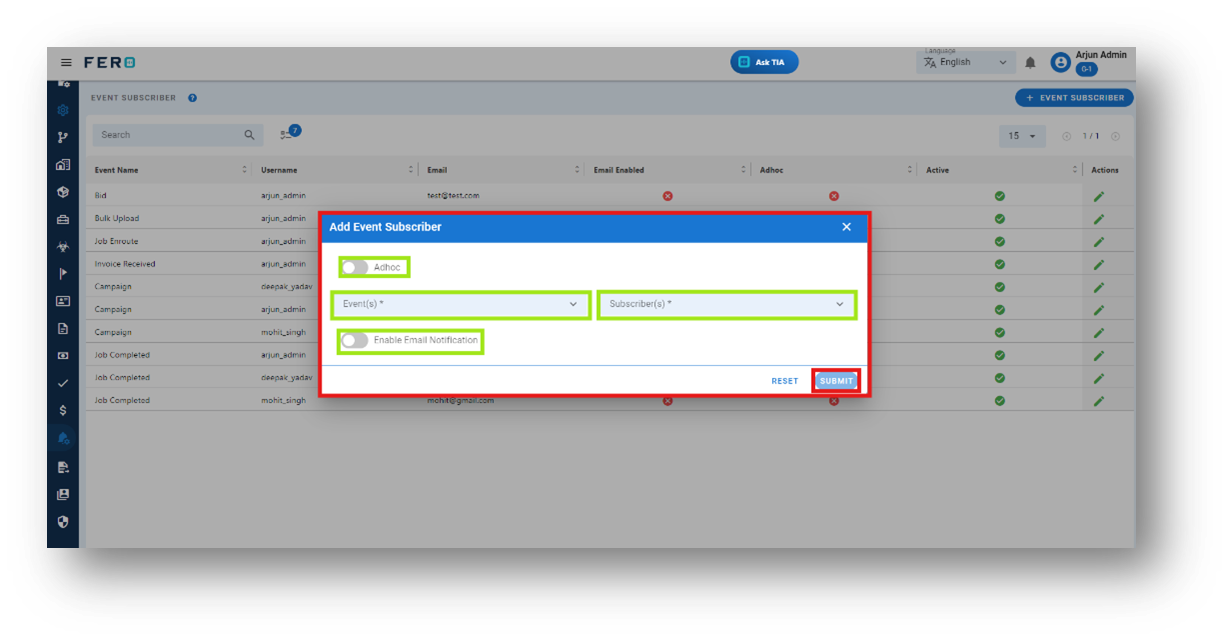 - Adhoc Toggle Button: If the subscriber is not listed in the module, enable the Adhoc toggle. The page will change, allowing you to enter the subscriber's email address so they can receive event notifications.
