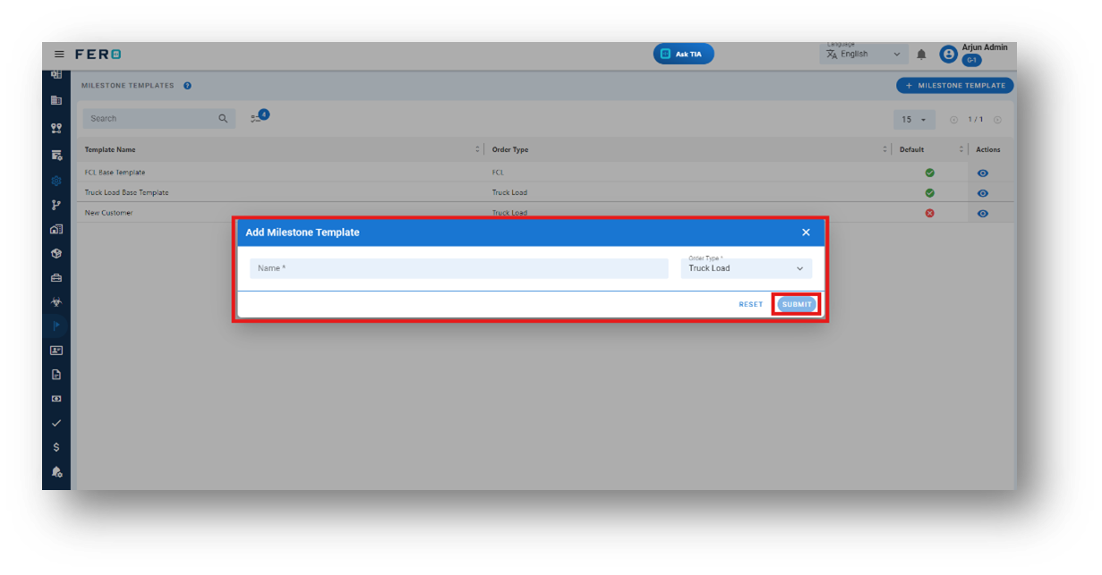 - Select Milestone order type Truck load or Container load from the drop-down option then click submit