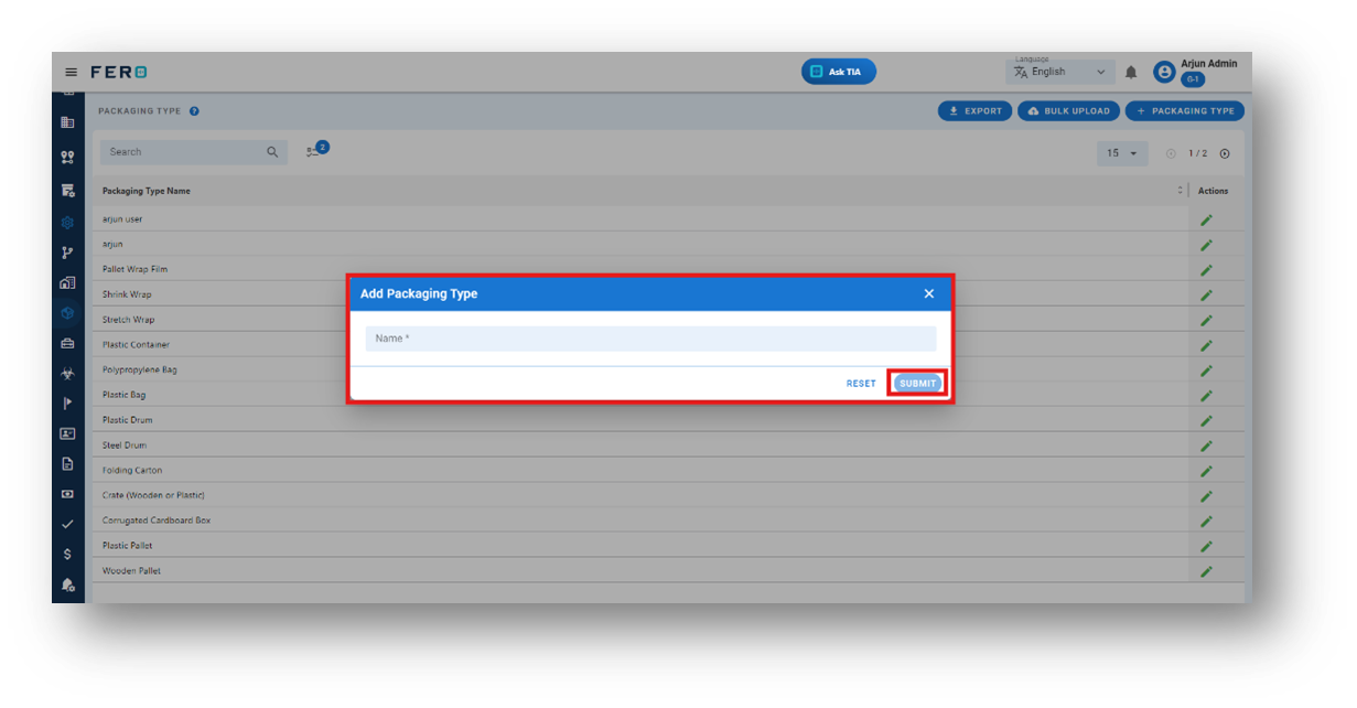 Step 4: Fill out the package type name and click the submit button. Your package type will be included in the packaging module.