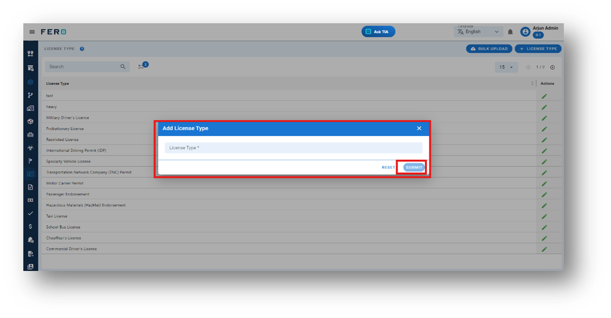 Step 4: Fill out the License type name and click the submit button. Your License type will be included in the License type module.