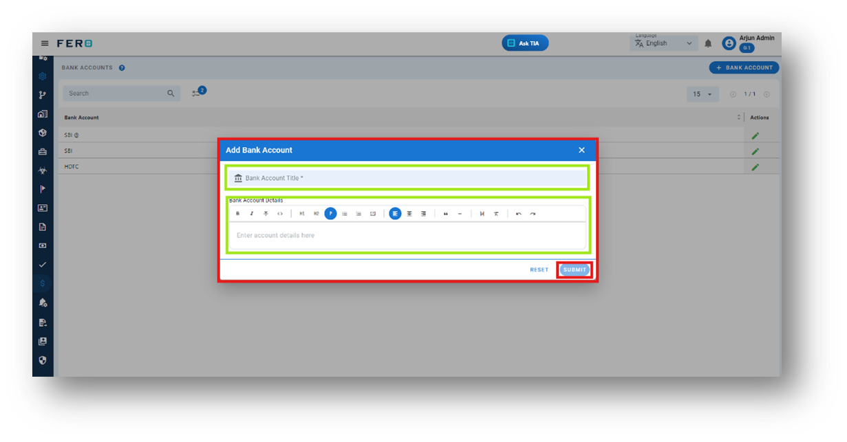 Absolutely, there are no limitations on the number of Bank Account. Depending on your business activities and operational requirements, multiple Bank Account can be seamlessly incorporated into your organization's structure.